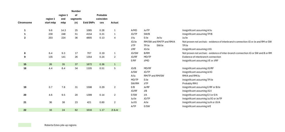 In the less crowded regions, in all but 3 cases, genealogy rules out the RSBCs having significance, for it provides an explanation for one of the possible matches entailed in those RSBCs (see here for an explanation of what the RSBCs may entail). But in three cases there is possible significance except that we cannot be sure that the matches are not archaic. Indeed, in the Cr10 location we found 5 matches with others sharing the 135656 location as a segment boundary.
