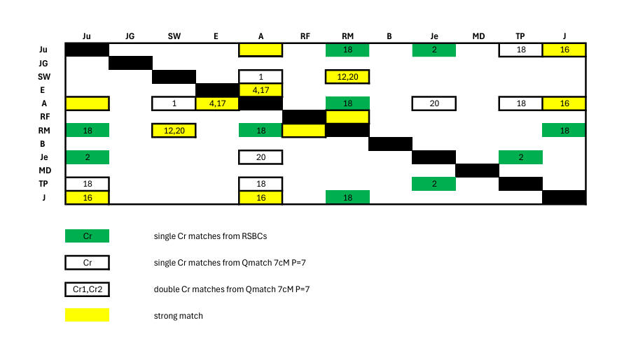 The matches given by Qmatch show interbranch connection - between A and the Fischls (SW) and the NY Lousadas (Je and TP). They also show that RM matches SW. But our small match procedure adds something - Cr2 giving Ju and TP both matching Je, and Cr18 (same location as in the Qmatch) giving us RM matching the 3 Barrow Lousadas Ju, A and J. This reinforces what Qmatch tells us - namely that the English Barrow Lousadas are related to the NY Lousadas, to the Fischls and to RM. (Incidentally the Cr20 locations in 2 of the Qmatches are not the same).