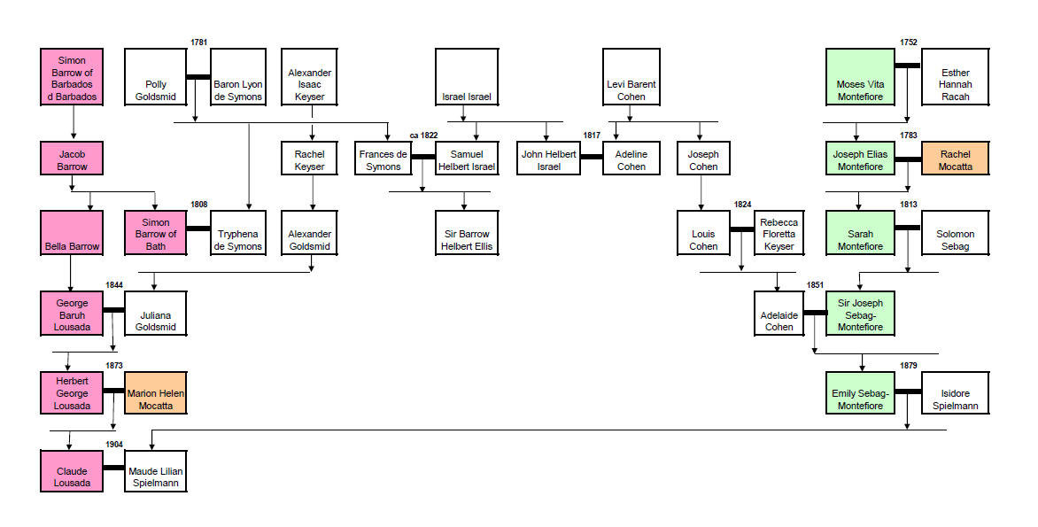 A link via the Barrows exists - Joseph Elias Montefiore in this chart was a brother of Eliezer Montefiore who married Judith Joseph Levi who was a cousin of Simon Barrow of Bath; the Barrows in Australia chart shows this marriage. And of course a link via the Mocattas exists as shown in the chart covering the marriage of Claude Lousada's parents. Finally, because all the descendants of Simon Barrow of Barbados are also descendants of Bailah Montefiore, there is a fundamental (Montefiore) link!