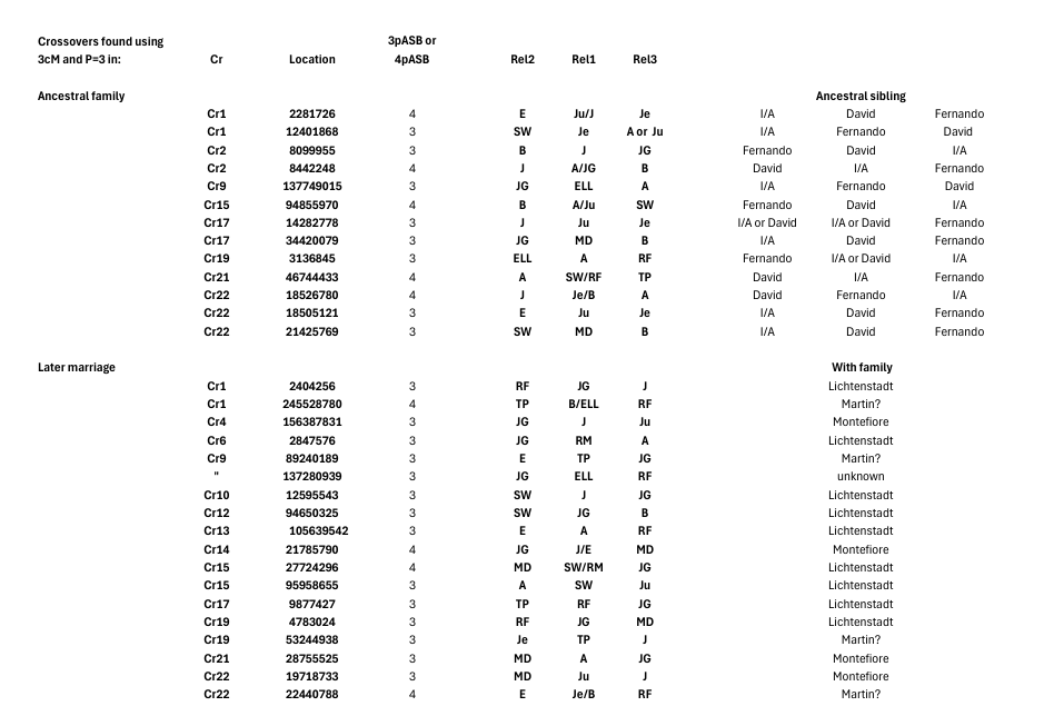 The higher ASB count with our random set reflects the vastly greater pool of ancestors. Our sample of relatives essentially entails just 5 ancestral families - Amador/Ana Mendes, Lichtenstadt, Montefiore, Martin? and one unknown, while the random set entails 10000 or so ancestral families (given the way ancestor numbers double each generation - remembering we are talking 11 generations). Also, it is obvious that ASBs can survive from pre-genealogical times so any random sample will reveal - mixed with more recent crossovers - many early crossovers using our technique. It is worth considering whether ASBs may be able, in the absence of genealogical information, to re-construct some lineages within a random sample - if that was of interest to researchers connected to the people in the sample. Finally we show the 31 crossovers which prove the connections referred to above: