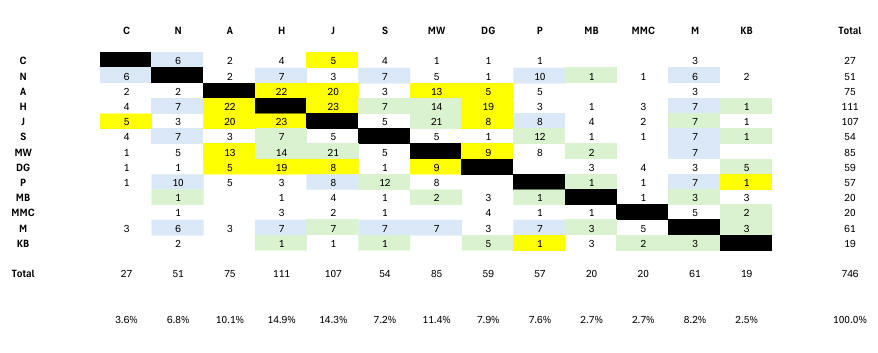 Finally, out of respect to those whose kit numbers went into generating the random sample, we re-present the table of random matches using our 6-match criterion. This shows perhaps 3 family linkages around 4-8 generations ago (A/H/J, MW/DG and N/M/P), together with an outlying group contributed by Julian Land (MB, MMC, KB). The random 'family' group of 10 contains kits contributed from John Griffiths (C, N, A, H, J) and Julian Land (S, MW, DG, M, P). If all the 56 matches contributed by the outlying group are false, then 135 matches in the 'family' group are false or 43% compared with 29% of the relatives' matches. That is, the blue matches are less likely to be real in this case than for our Baruch Lousada relatives above, and there are fewer of them (10/45 = 22%) compared with the Lousada relatives (30/78 = 38%).