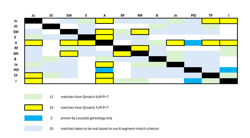 Above in the chart of relative matches, we can see the 4 categories of relative - English Lousada (MD), Barrow-Lousada (Ju, A, J), Barrow (E, JG, RM, RM, SW), and US Lousada (ELL, B, Je, TP). There is so much inter-branch matching that we may feel confident that the branches join at an ancestral family (of Amador de Lousada). This is despite the fact that some relatives (especially J and E) match more reluctantly than others. Illustrations of the inter-connectedness of the branches are:
