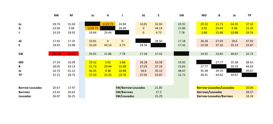In this table, we note the high match due to Ju and A being 1st cousins, and of course SW's elevated matches with Randy's parents. In addition to Randy's parents having Baruch Lousada ancestry, they would likewise have descent from Baruch Lichtenstadt. On the other hand SW whilst having Baruch Lousada ancestry might not have ancestry from Baruch Lichtenstadt who appears to have been a second husband. The second table does not conclusively settle these matters, but SW's matches do elevate the Barrow Lousadas compared with the Barrows, but this could simply be due to enhanced Baruch Lousada ancestry - as would be expected from the fact that SW matches the Lousadas relatively well.